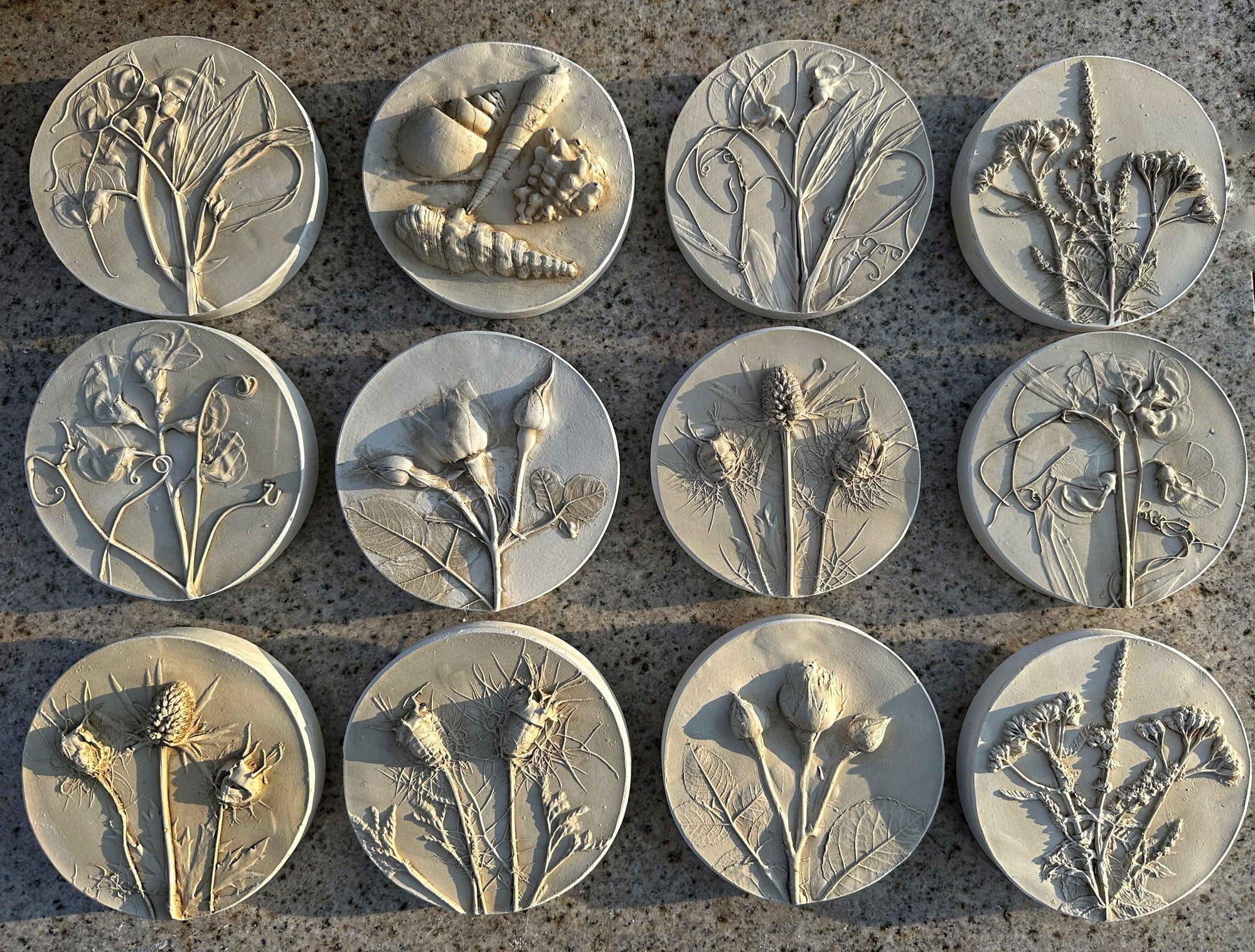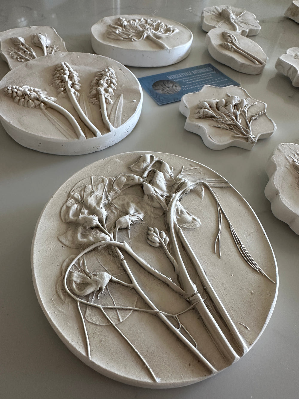 Each piece is a one-of-a-kind creation, capturing the delicate beauty of botanicals in handcrafted lime plaster. Artisanal works that celebrate nature's ephemeral moments.